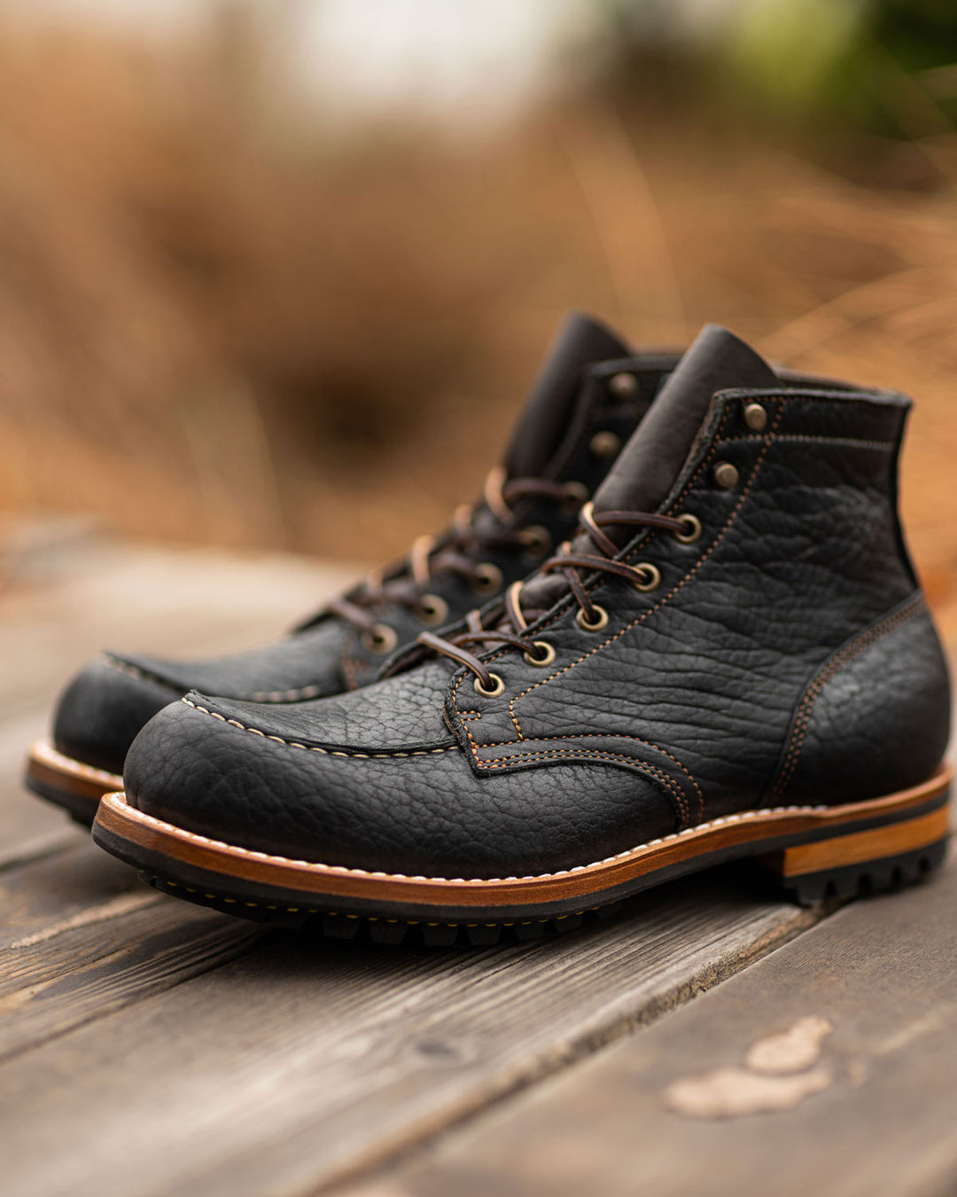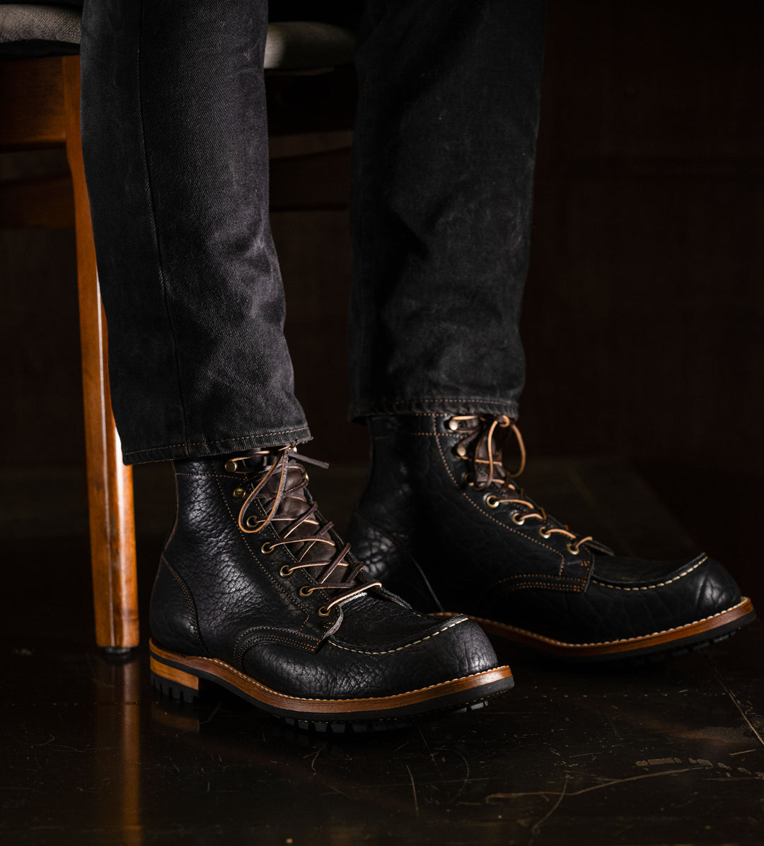 Truman Why: Black Shrunken Bison is a hefty leather, marked by its unique, one of a kind texture. Very thick, and even more supple.