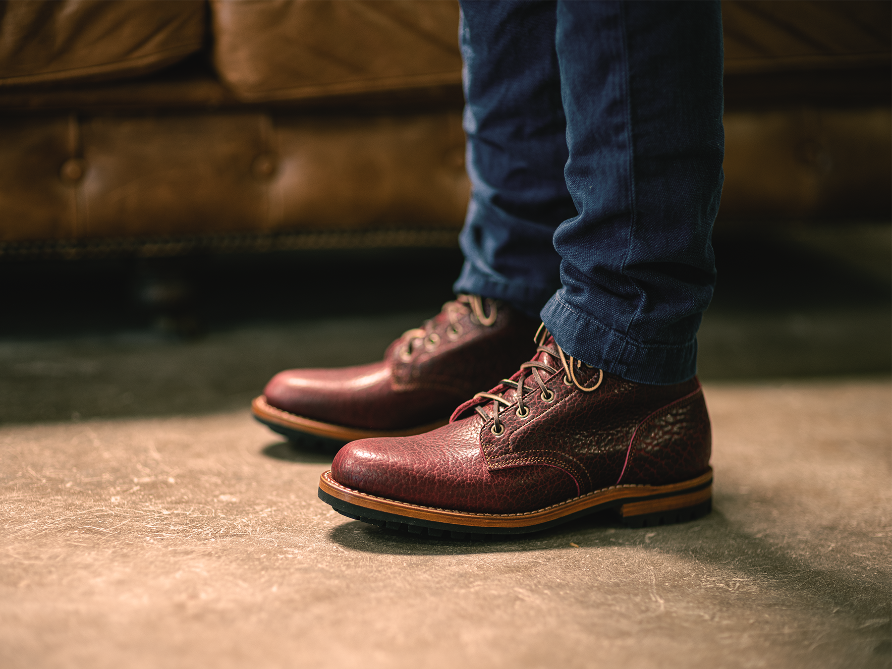 This leather derived from American Bison sports a truly unique appearance once Law Tanning is done with it. Their tannery in Wisconsin takes the bison hides, and through a proprietary tanning process that hinges on shrinking, we get this deeply textured leather. Rich in pull up, Law's process makes for both the beauty and comfort we seek in the leathers we work with.